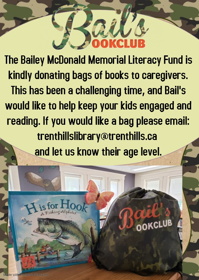 The Bail’s Book Club is a program partnered with local schools to help children develop their reading skills. This program was funded through the support of the McDonald Family and the community in memory of Bailey McDonald. This fund also supports children in distress by placing Bail’s Book Bags in emergency vehicles (O.P.P Cruisers, Fire Trucks) the Hospital, Bridge Hospice and Hillside Medical Centre. Please contact the library if you know of a child in need at (705) 653-3611. Visit or contact any of our branches to learn more about this wonderful program!